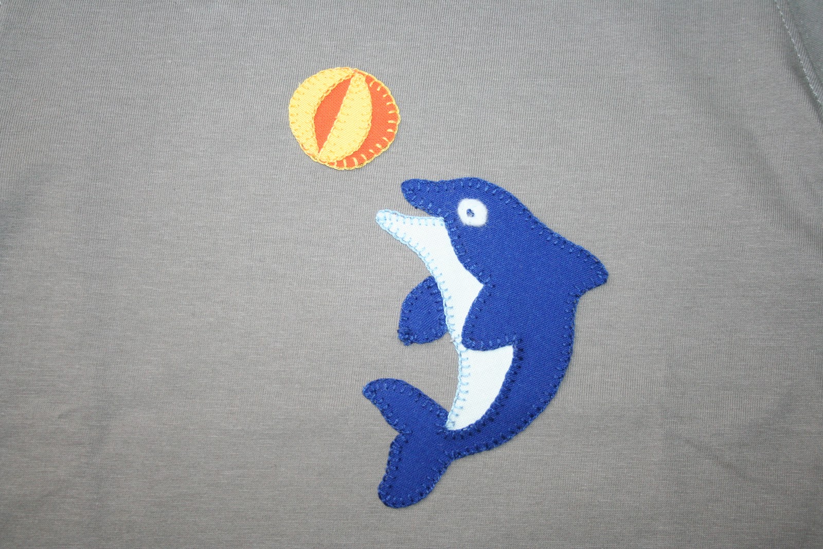 El meu nebot té 3 anys i va a la classe dels dofins, o sigui que vaig pensar que li agradaria tenir una samarreta amb un dofí, i si a més a més el dofí jugava amb una pilota, encara millor! m'ha quedat així: